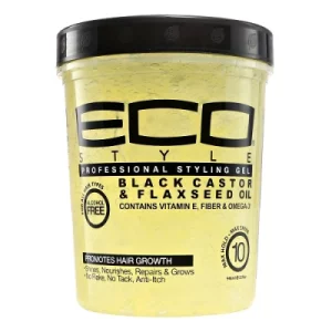 Eco Style Black Castor and Flaxseed Oil Styling Gel helps to nourish, and repair damaged hair while promoting a healthy scalp. This gel provides superior hold, long lasting shine and effortless style. This weightless gel is great for all hair types and contains wheat protein which strengthens and protects hair.